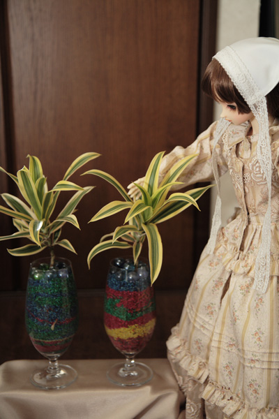 その中のひとつにグラスの中にいろんな色の土を入れて観葉植物を飾る