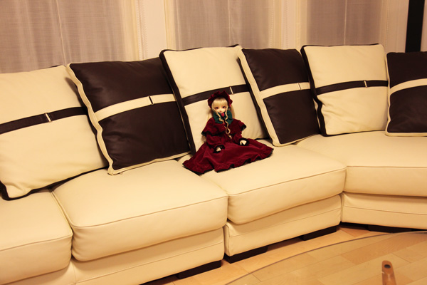 白とこげ茶のオシャレなソファは、すでに汚れの危機に直面してたりして・・・(;^_^A