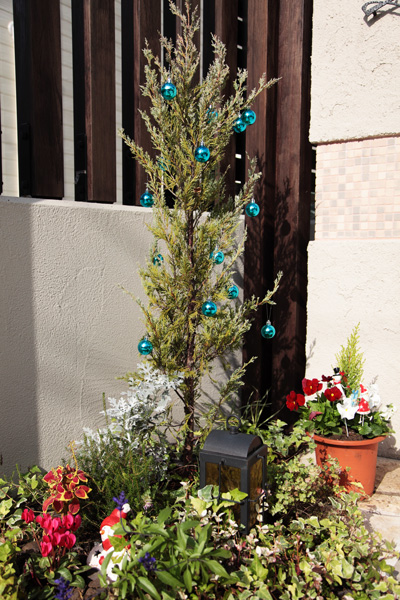 少し間引いた飾り玉を門の前の木にも付けてみました♪
